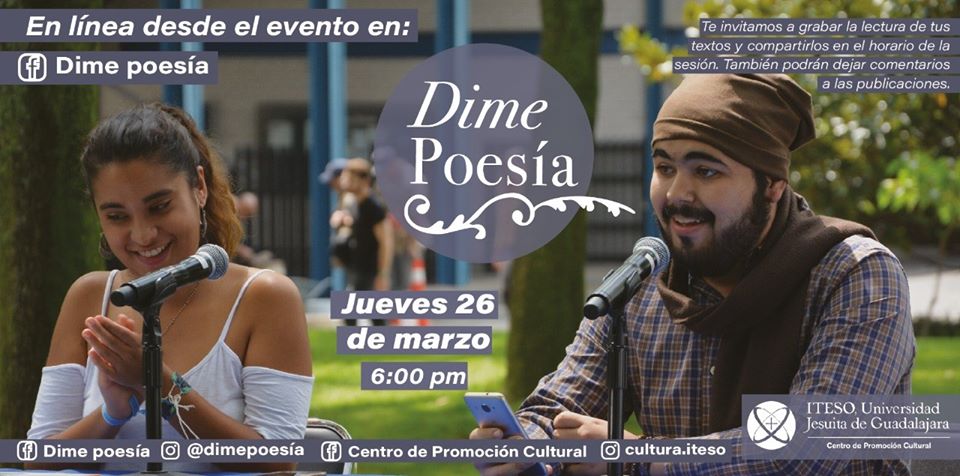 Con motivo del virus Covid 19, que ha obligado a que la gente se quede en casa, el colectivo literario Dime Poesía llevó a cabo su primera sesión en línea el pasado 26 de marzo. Como cada último jueves del mes, este proyecto alberga a un público interesado en compartir sus creaciones literarias y a expresarse por medio de la palabra.